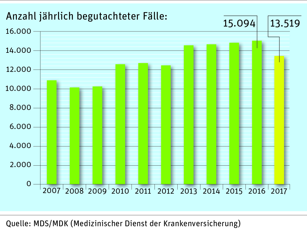 13.519 Sachverständigengutachten zu vermuteten Behandlungsfehlern haben die Medizinischen Dienste der Krankenversicherung (MDK) 2017 bundesweit erstellt. Die MDK-Fachärzte bestätigten jeden vierten Behandlungsfehler-verdacht (24,7 Prozent). In jedem fünften Fall (19,9 Prozent) stellten sie fest, dass die Schädigung des Patienten durch den Fehler verursacht wurde. Das geht aus der MDK-Begutachtungsstatistik hervor, die heute in Berlin vorgestellt wurde. Die Medizinischen Dienste setzen sich für die Weiterentwicklung der Sicherheitskultur in der Medizin und eine systematische Fehlervermeidung ein.