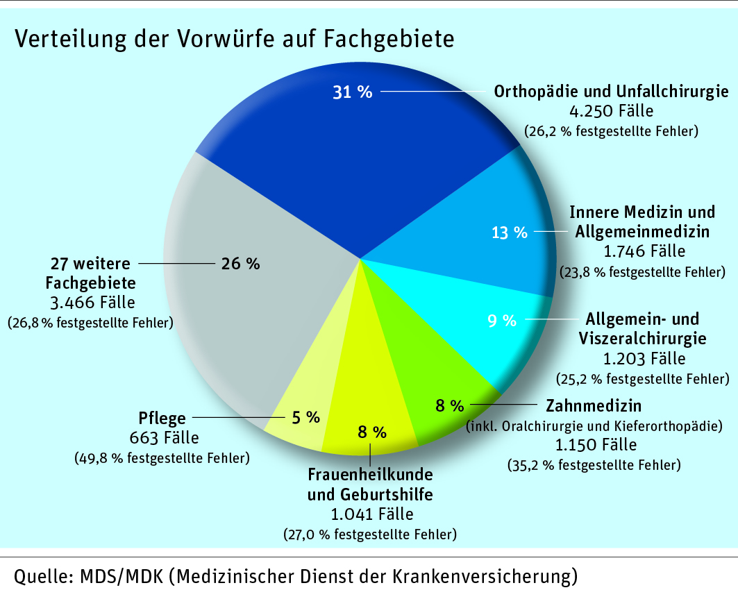 Schaut man sich die Vorwürfe verteilt auf die Fachgebiete an, ergibt sich folgendes Bild: 31 Prozent (4.250 Fälle) aller Vorwürfe bezogen sich auf Orthopädie und Unfallchirurgie, 13 Prozent (1.746 Fälle) auf Innere Medizin und Allgemeinmedizin, 9 Prozent (1.203 Fälle) auf Allgemeinchirurgie, 8 Prozent (1.150 Fälle) auf Zahnmedizin, ebenfalls 8 Prozent (1.041 Fälle) auf Frauenheilkunde und 5 Prozent (663 Fälle) auf die Pflege. „Eine hohe Zahl an Vorwürfen lässt aber nicht auf eine hohe Zahl an tatsächlichen Behandlungsfehlern schließen und sagt auch nichts über das Risiko in einem Fachgebiet aus“, erklärt Zobel. Am häufigsten bestätigten die MDK-Fachärzte Fehlervorwürfe in der Pflege (49,8 Prozent), gefolgt von der Zahnmedizin (35,2 Prozent) und an dritter Stelle Frauenheilkunde (27 Prozent).