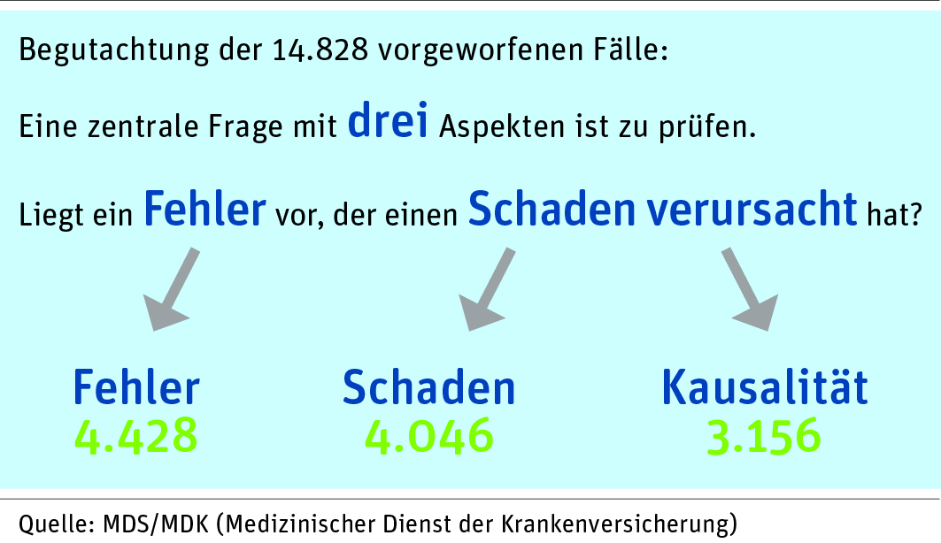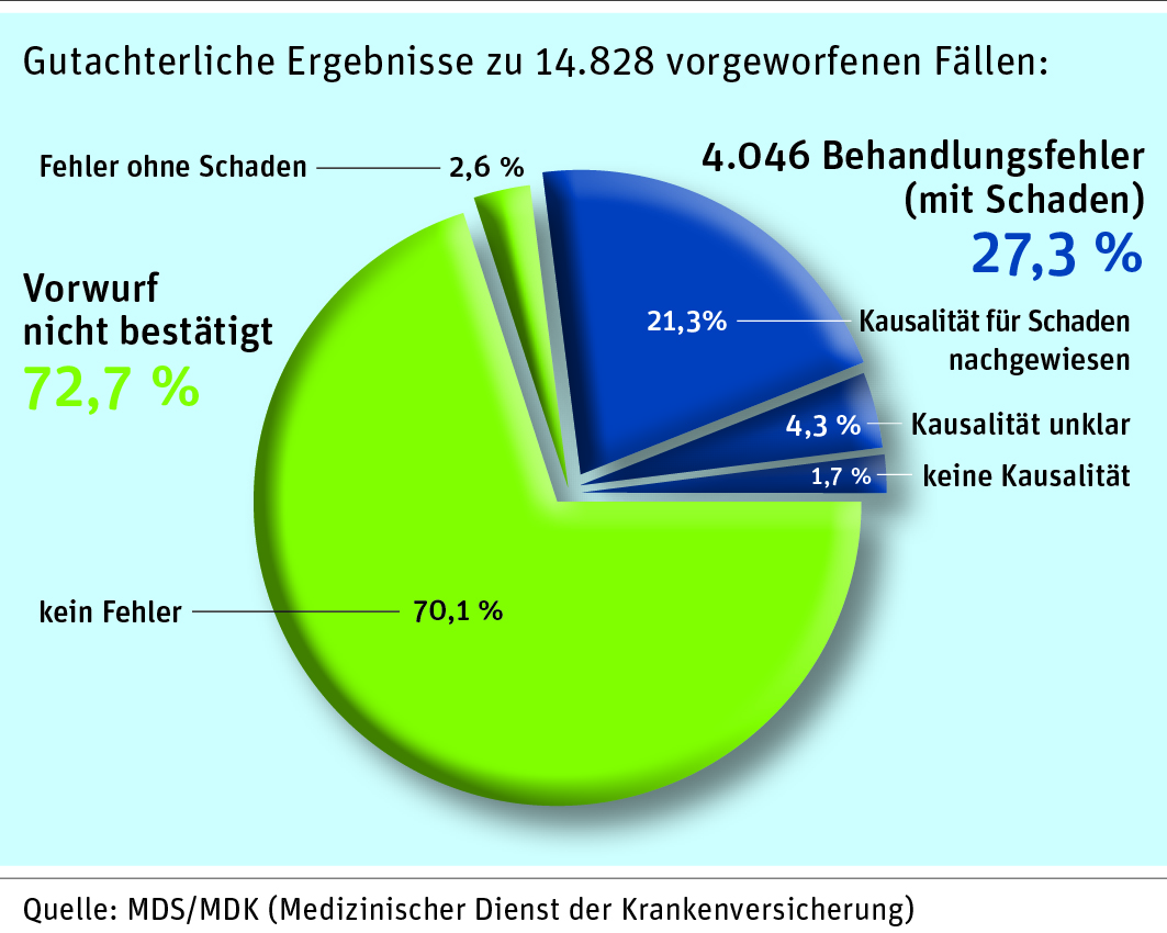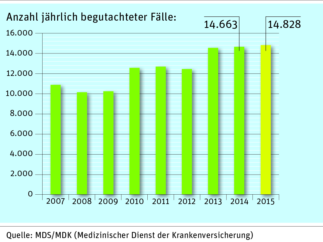 "Seit Inkrafttreten des Patientenrechtegesetzes vor drei Jahren gibt es einen anhaltenden Aufwärtstrend. Gegenüber dem Vorjahr ist die Zahl der Vorwürfe und damit die Nachfrage nach Sachverständigengutachten des MDK wieder leicht gestiegen", sagt Dr. Stefan Gronemeyer, Leitender Arzt und stellvertretender Geschäftsführer des MDS. Im Jahr 2015 gingen die MDK-Gutachter in 14.828 Fällen einem Behandlungsfehlervorwurf nach; im Vorjahr waren es noch 14.663 Fälle. Auch bei den bestätigten Fehlern hat sich die Zahl erhöht von 3.796 auf 4.046.