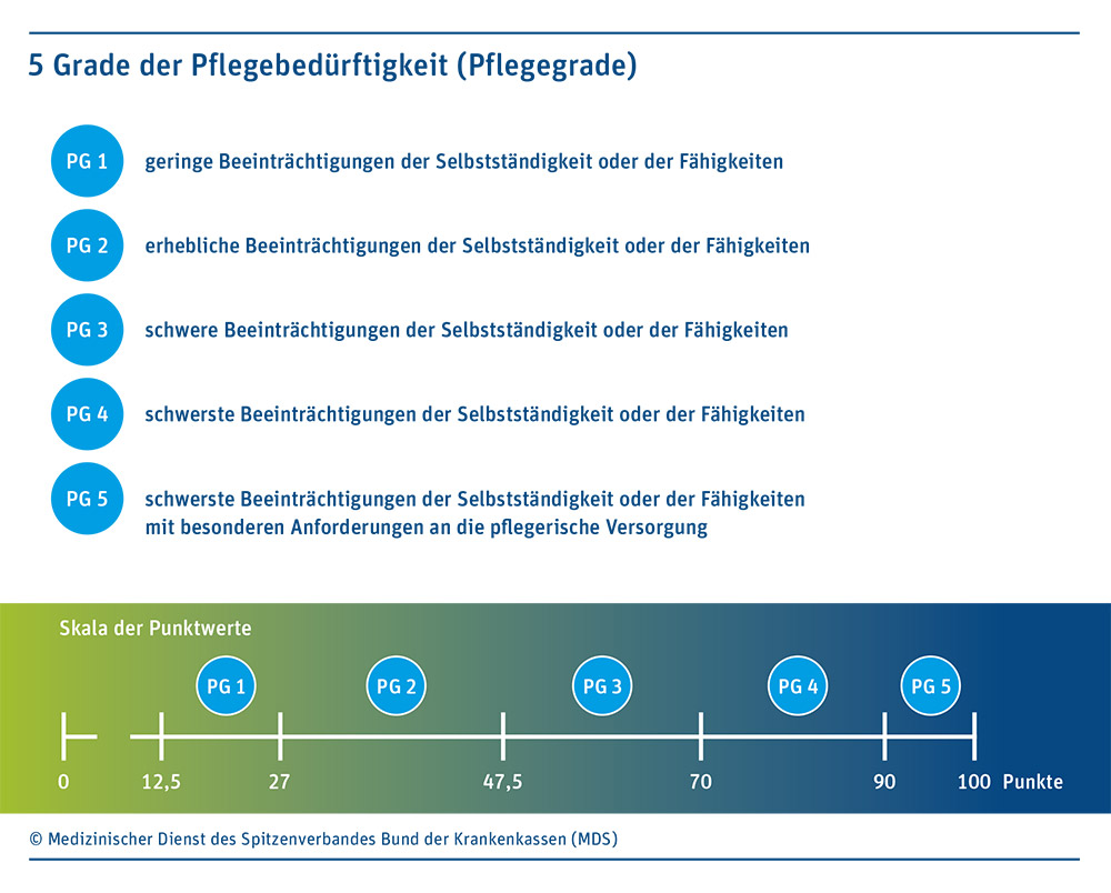 Der MDK-Gutachter erstellt ein Pflegegutachten, das nicht nur die Empfehlungen für einen Pflegegrad, sondern auch für geeignete Maßnahmen der Prävention, Rehabilitation sowie für Heil- und Hilfsmittel enthält. Das Gutachten sendet der MDK zur Pflegekasse. Von dort erhält der Versicherte den Leistungsbescheid und das Gutachten. Bislang erfolgt die Einordnung der Pflegebedürftigkeit in drei Stufen. Dieses System wird zum 1. Januar auf fünf Pflegegrade umgestellt. Für Versicherte, die bereits Leistungen erhalten, erfolgt die Umstellung auf Pflegegrade automatisch. Eine neue Begutachtung ist dafür nicht erforderlich.