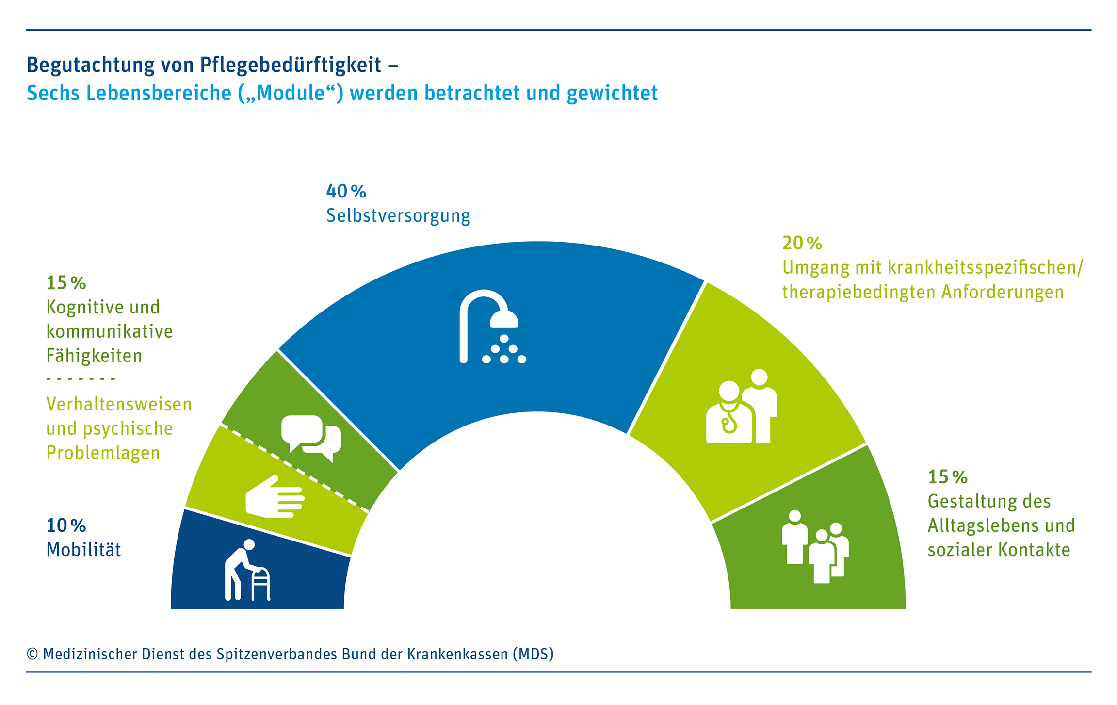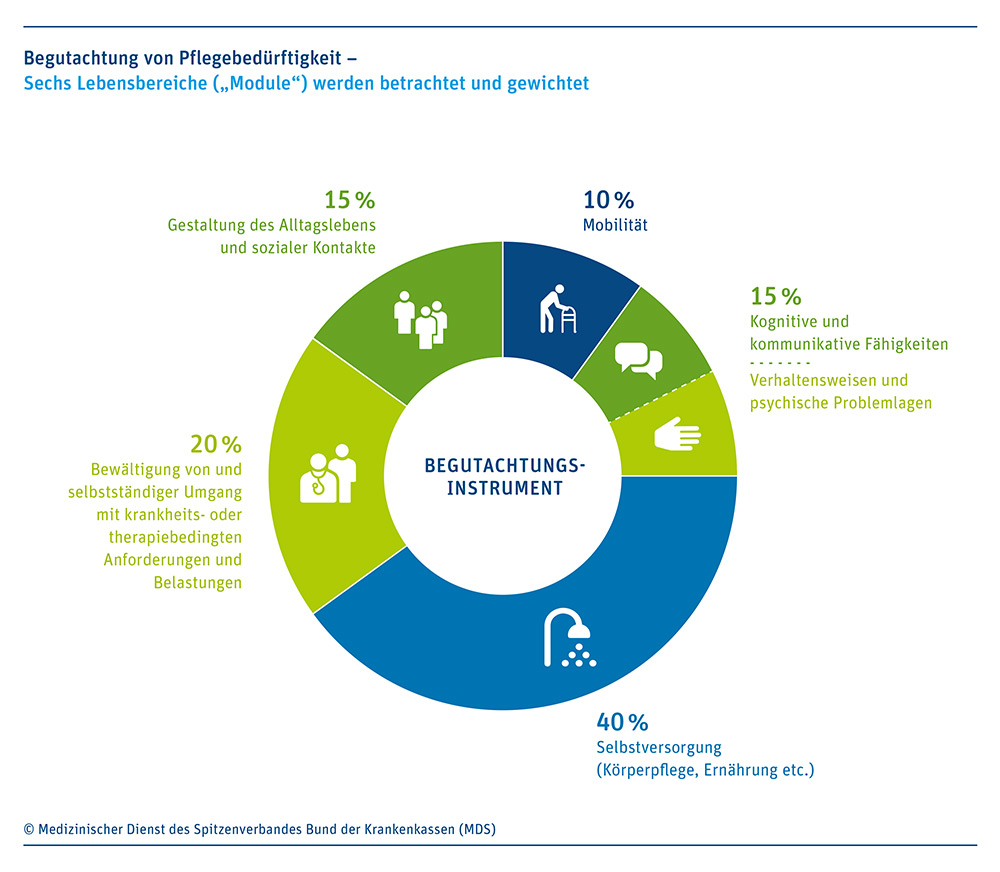 „Mit der Reform wird die Pflegeversicherung grundlegend verändert. Sie stärkt die Versorgung der pflegebedürftigen Menschen insgesamt und schafft einen gerechteren Zugang zu den Leistungen. Ein sehr großer und sehr wichtiger Schritt hin zu einer besseren Versorgung wird damit umgesetzt“, sagt Dr. Peter Pick, Geschäftsführer des MDS. Kern der Reform ist die Einführung des neuen Pflegebedürftigkeitsbegriffs und des damit verbundenen neuen Begutachtungsverfahrens für den MDK. Ab dem 1. Januar orientiert sich die Feststellung der Pflegebedürftigkeit am Grad der Selbstständigkeit in den elementaren Lebensbereichen Mobilität, kognitive und kommunikative Fähigkeiten, Verhaltensweisen und psychische Problemlagen, Selbstversorgung, Bewältigung und Umgang mit Krankheit und Therapien, Gestaltung des Alltagslebens und sozialer Kontakte, fest. Für jeden einzelnen Bereich werden Punktwerte ermittelt, die gewichtet und zusammengezählt eine Empfehlung für einen der fünf neuen Pflegegrade ergeben. Diese Bemessung löst die Erhebung der Pflegeminuten ab.