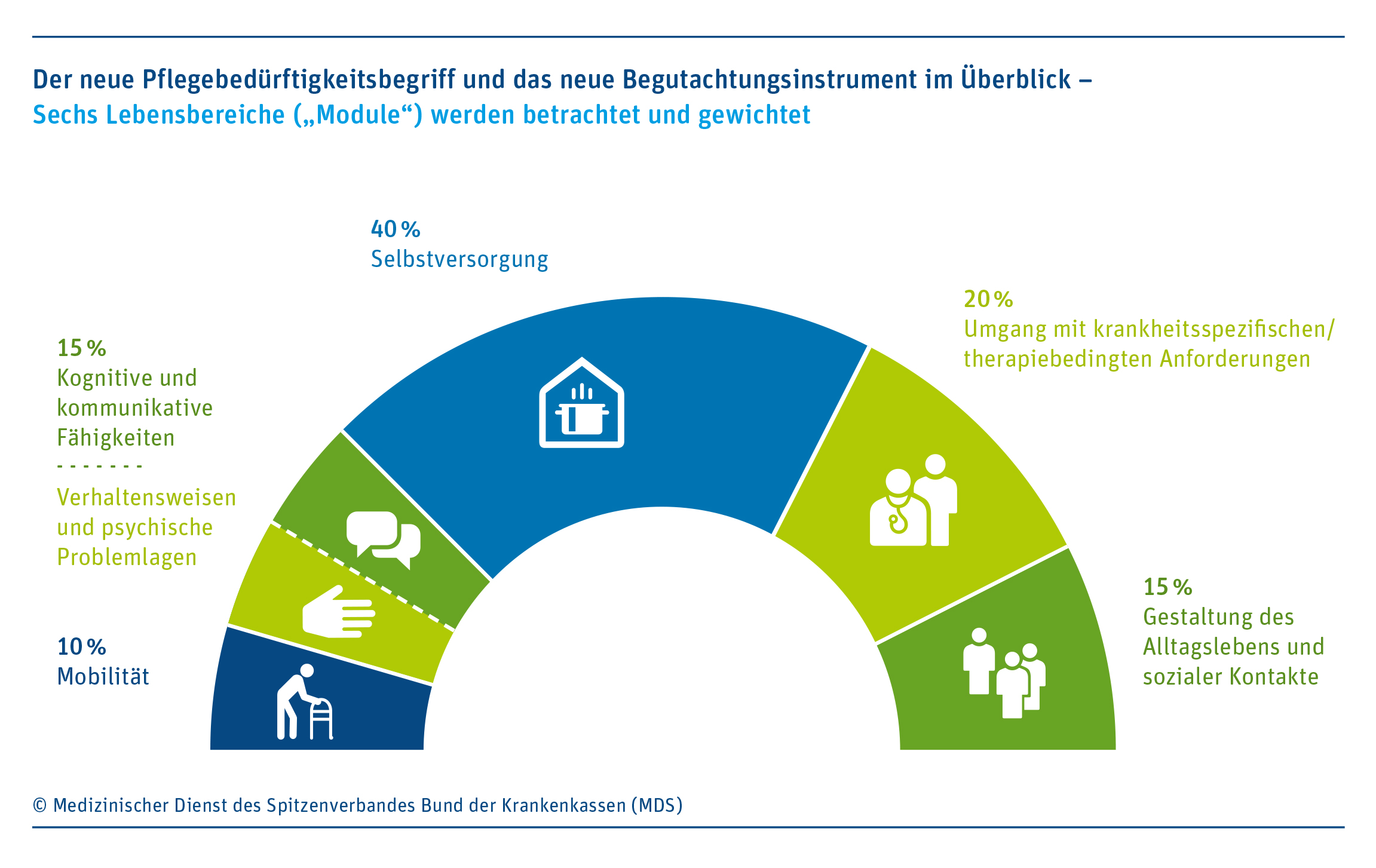 „Mit der Reform wird die Pflegeversicherung grundlegend verändert. Sie stärkt die Versorgung der pflegebedürftigen Menschen insgesamt und schafft einen gerechteren Zugang zu den Leistungen. Ein sehr großer und sehr wichtiger Schritt hin zu einer besseren Versorgung wird damit umgesetzt“, sagt Dr. Peter Pick, Geschäftsführer des MDS. Kern der Reform ist die Einführung des neuen Pflegebedürftigkeitsbegriffs und des damit verbundenen neuen Begutachtungsverfahrens für den MDK. Ab dem 1. Januar orientiert sich die Feststellung der Pflegebedürftigkeit am Grad der Selbstständigkeit in den elementaren Lebensbereichen Mobilität, kognitive und kommunikative Fähigkeiten, Verhaltensweisen und psychische Problemlagen, Selbstversorgung, Bewältigung und Umgang mit Krankheit und Therapien, Gestaltung des Alltagslebens und sozialer Kontakte, fest. Für jeden einzelnen Bereich werden Punktwerte ermittelt, die gewichtet und zusammengezählt eine Empfehlung für einen der fünf neuen Pflegegrade ergeben. Diese Bemessung löst die Erhebung der Pflegeminuten ab.