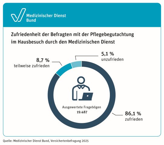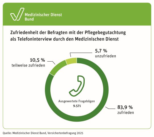 Für die Befragung wertete die wissenschaftliche Stelle bundesweit rund 31.000 anonymisierte Fragebögen aus dem Jahr 2025 (20.469 Hausbesuch, 10.117 Telefoninterview) aus. Demnach waren 86,1 Prozent der Befragten mit der Begutachtung im Hausbesuch insgesamt zufrieden; 8,7 Prozent teilweise zufrieden und 5,1 Prozent unzufrieden. 83,9 Prozent der Befragten zeigten sich insgesamt mit der Begutachtung mittels strukturiertem Telefoninterview zufrieden; 10,5 Prozent teilweise zufrieden und 5,7 Prozent unzufrieden. Damit nähern sich die Zufriedenheitswerte beider Begutachtungsarten an.